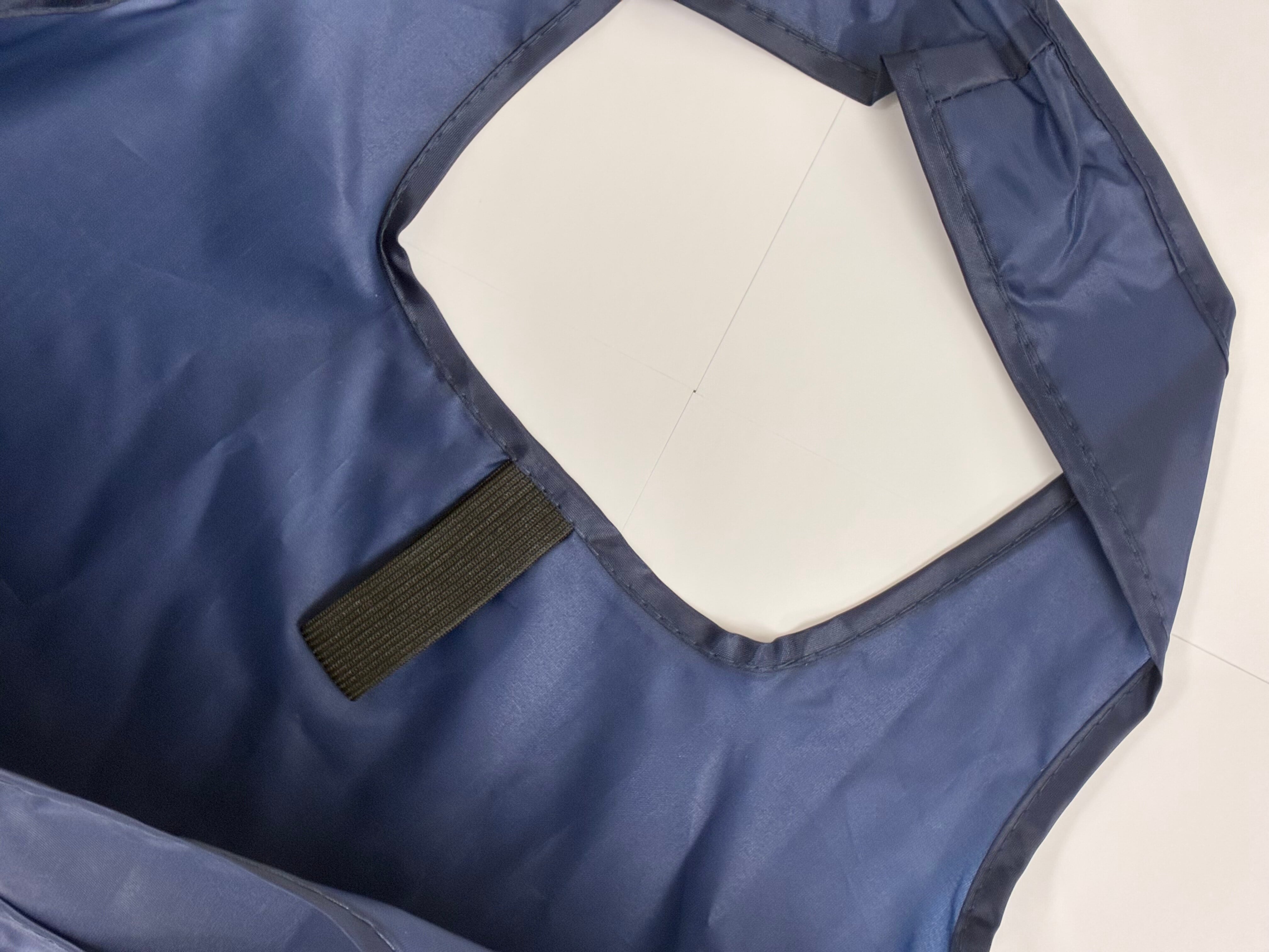 ネイビーにホワイトのロゴデザインで、どんな装いにもなじみ、普段使いしやすい一枚。内側にはゴム付きで、小さくまとめてコンパクトにできます。